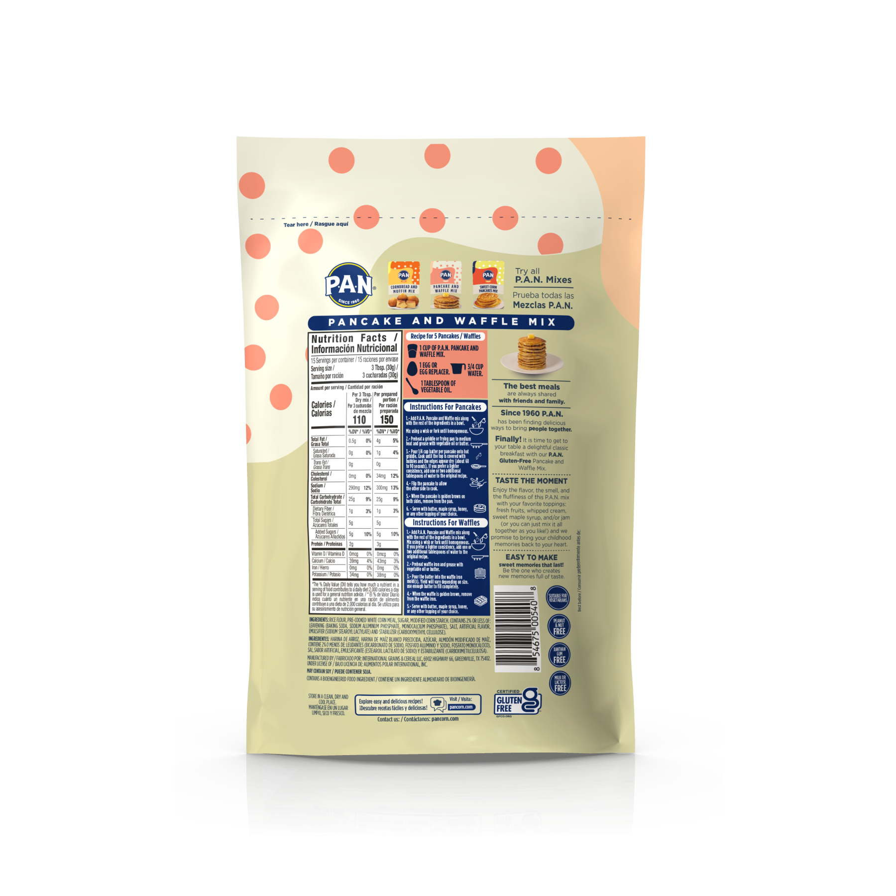 La Mezcla para Panquecas y Waffles P.A.N. está hecha con harina de maíz blanco precocida y harina de arroz; ofrece panquecas esponjosas y waffles crujientes con un sabor delicioso y, lo más importante, es libre de gluten.